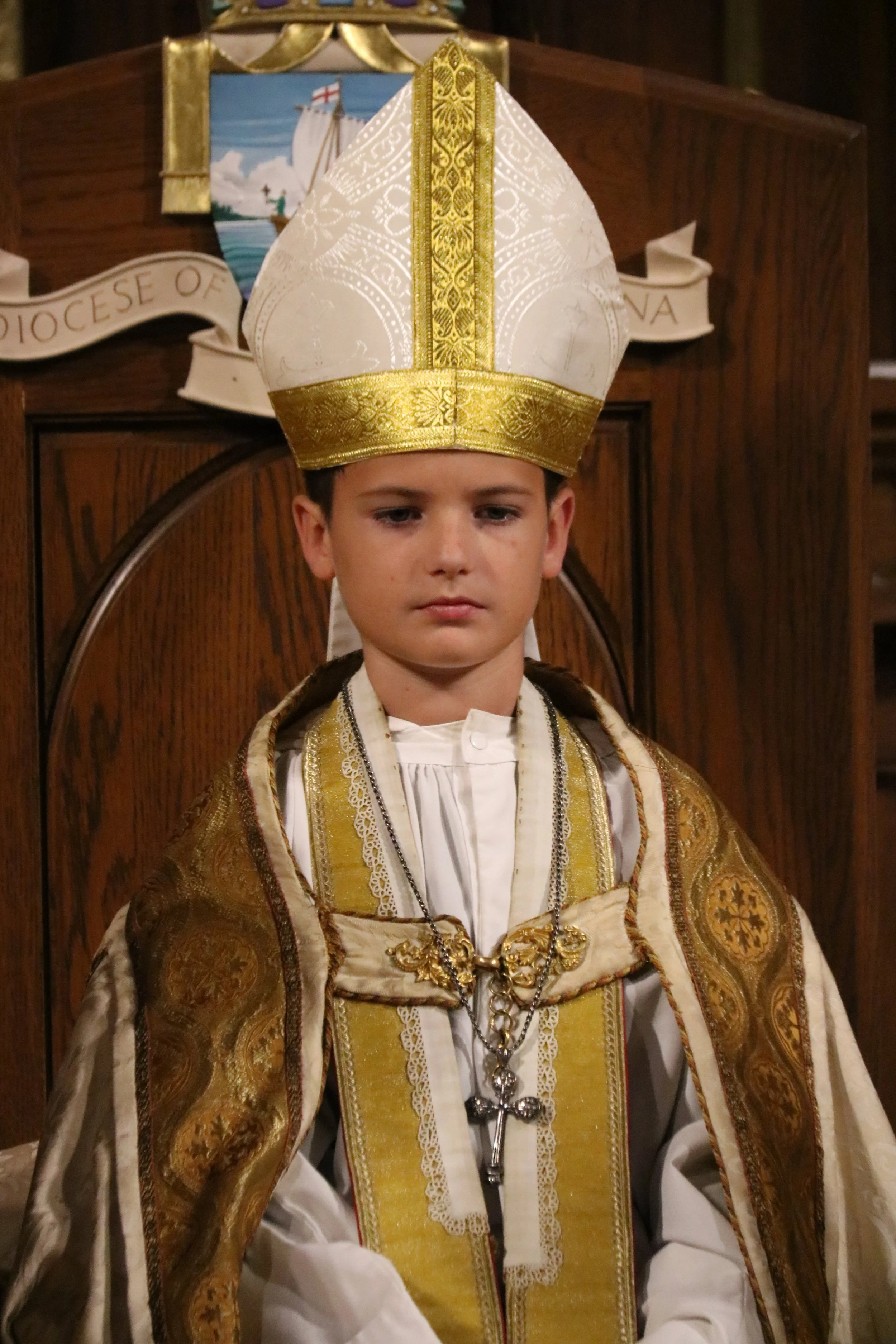 Traditional ceremony of installing a boy bishop at Evensong. This medieval custom embodies the words of the Magnificat, “he hath exalted the humble of meek.” A youth, who is a leader in the parish, is chosen to be the boy bishop each year. He “serves” until the Feast of the Holy Innocents on December 28.